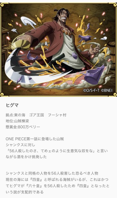 74 56皇殺しほんとすこ 67 ヒグマは元々海賊で東の海で目ぼしい海賊を全部狩る その後その金を元手に軍と交渉して懸賞金を下げてもらう 代わりに海賊をやめさせられたので仕方なく山賊に 軍は海賊としての懸賞金は付かないが山賊としては付けられる『one piece』(ワンピース ルフィは、新たに七武海の一人となっていたローと同盟を結び、四皇 〝百獣のカイドウ〟を倒すための作戦を開始する。ローの策に従いルフィたちは、パンクハザードを根城にする元政府の科学者シーザー・クラウンの誘拐に乗り出す。シーザーと手を組む王下七武ワンピース ワールドコレクタブルフィギュア 大海賊百景 vol5 全10弾構成で全60種の長編ワーコレ弾が登場! 目つきが鋭く! vol1 TV003とポーズが似ています。 新・旧とワーコレの進化を感じれますね。 観ていて面白いですよね。 蹴り範囲が広いです